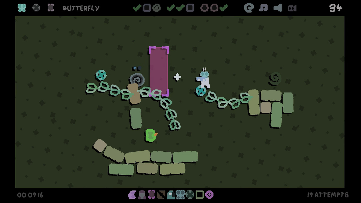 Next time you hit the level, maybe we’ve got a butterfly that lets us teleport elsewhere, and then teleport back a few seconds later. A rectangle where gravity is reversed. And the power to pin platforms… permanently. So we try again, and fall off the level.