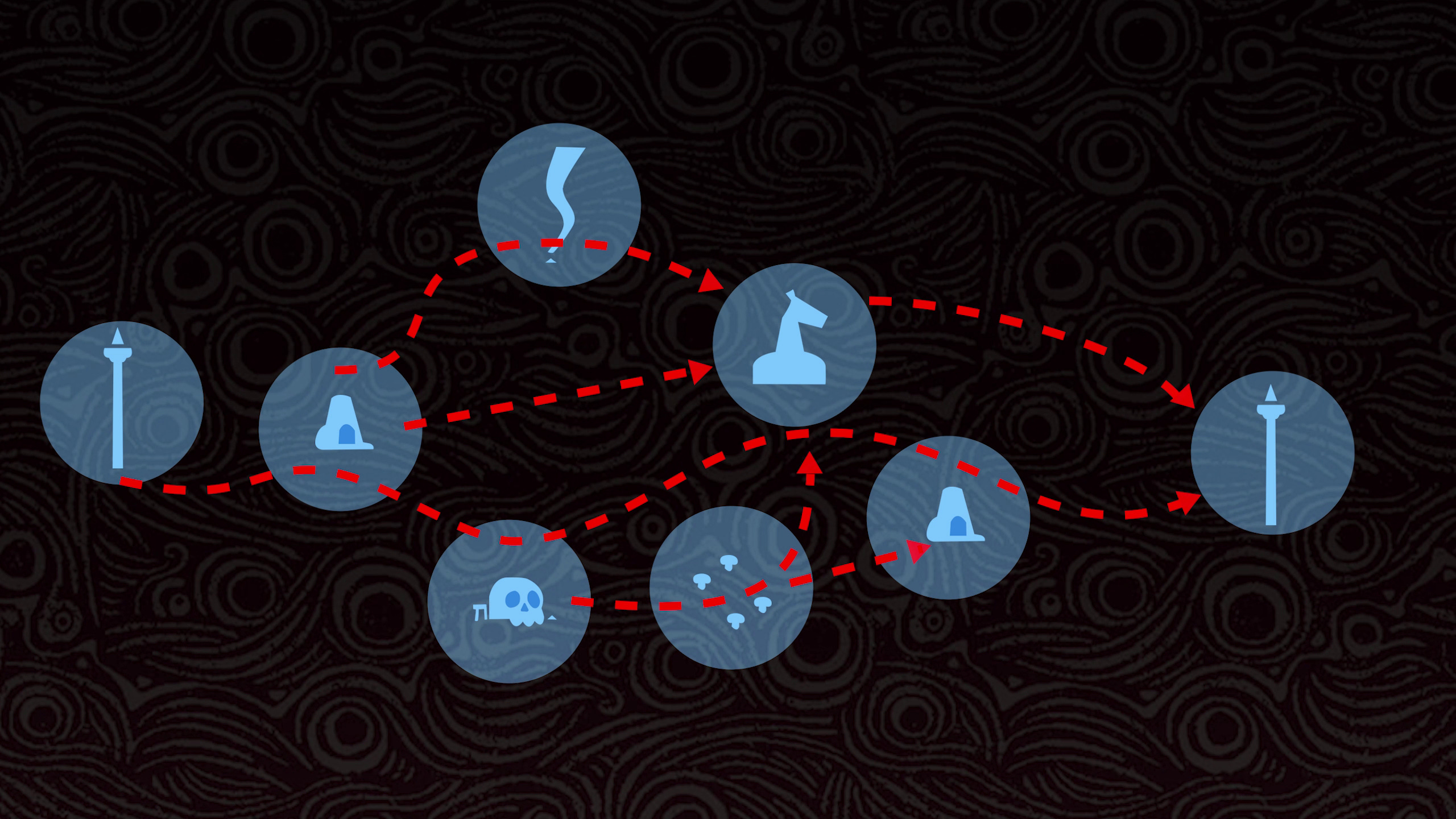 Players would naturally pick places to go, based on their own curiosity - and depending on their current goal or mood. Locations might be more or less attractive based on what you need: if you're looking to increase power, then shrines and enemy camps suddenly become more attractive than stables and towers. Then when night falls, other locations become more visible and appealing.