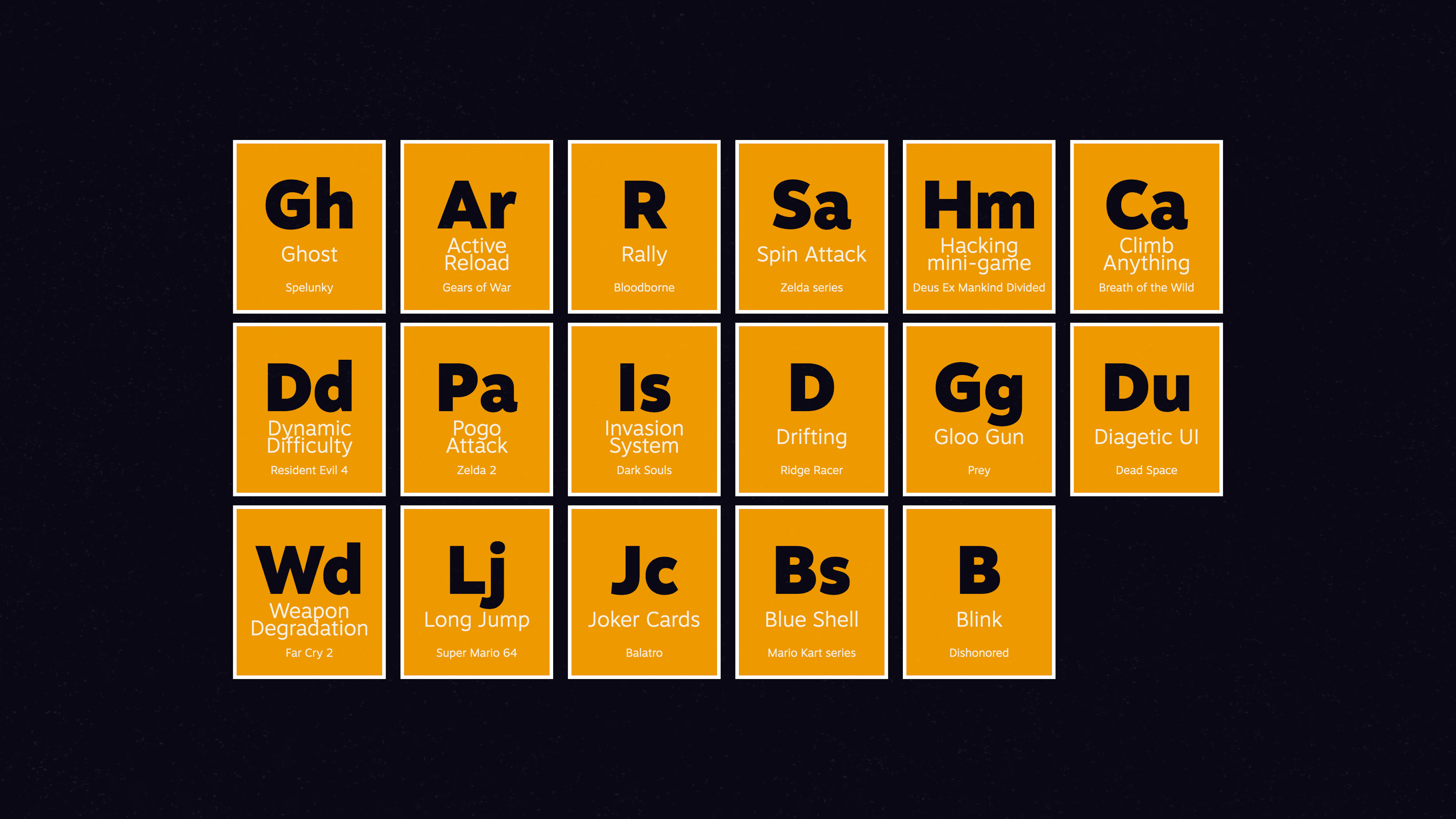 Create a periodic table of game mechanics and systems in your mind. This will make it easier to pick and choose the ones you want, and will help you mash up, change, and remix these elements into new forms.