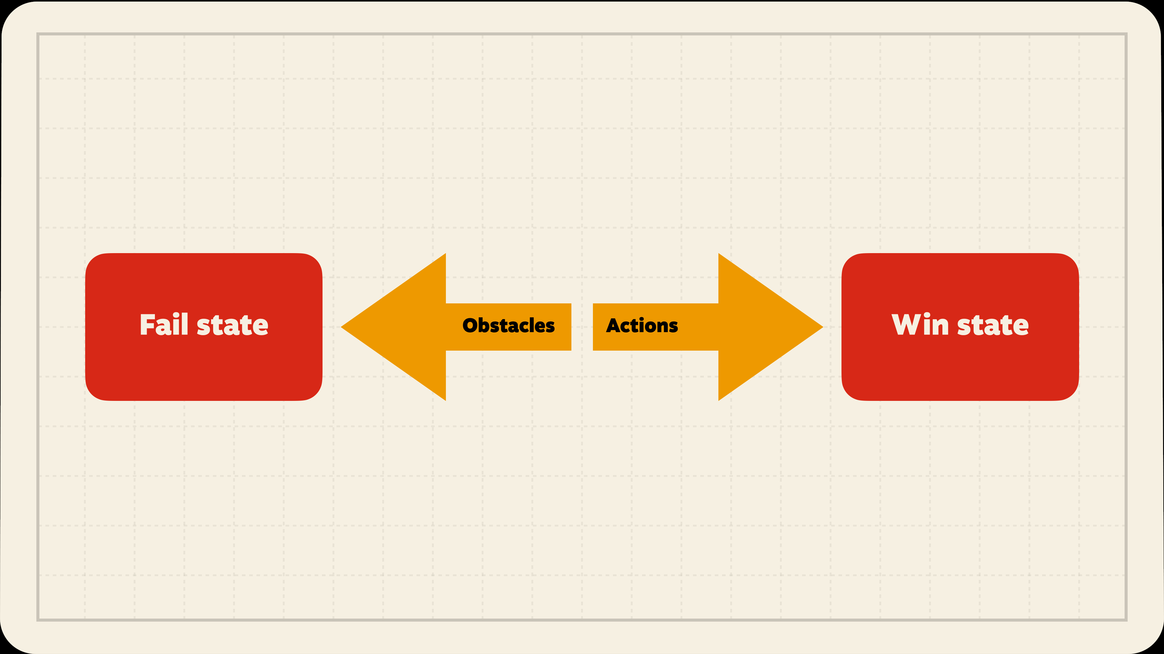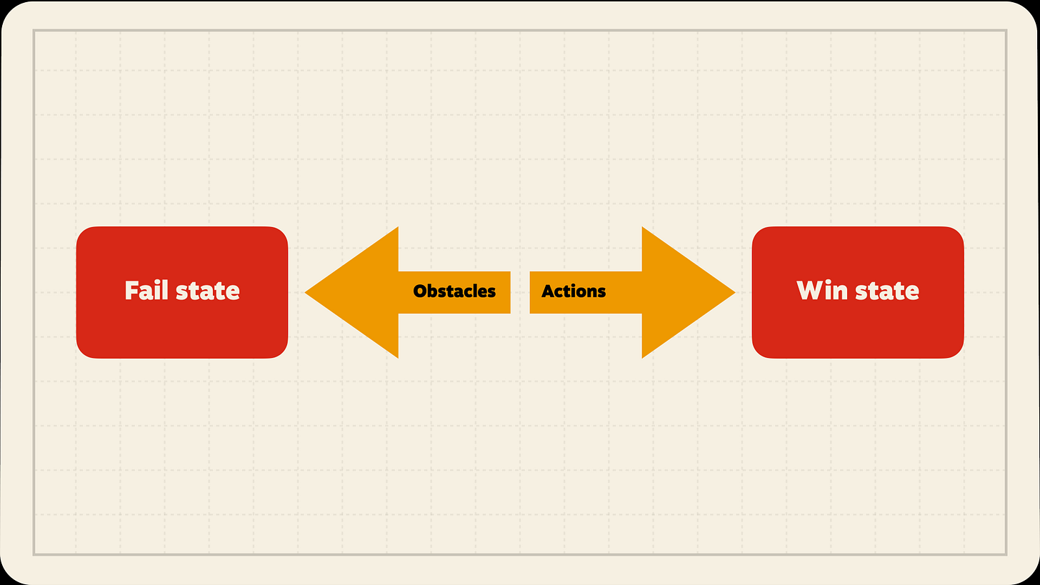 Then, what is pushing the player away from that win state? What's getting in the way and stopping them from succeeding? What is the obstacle?