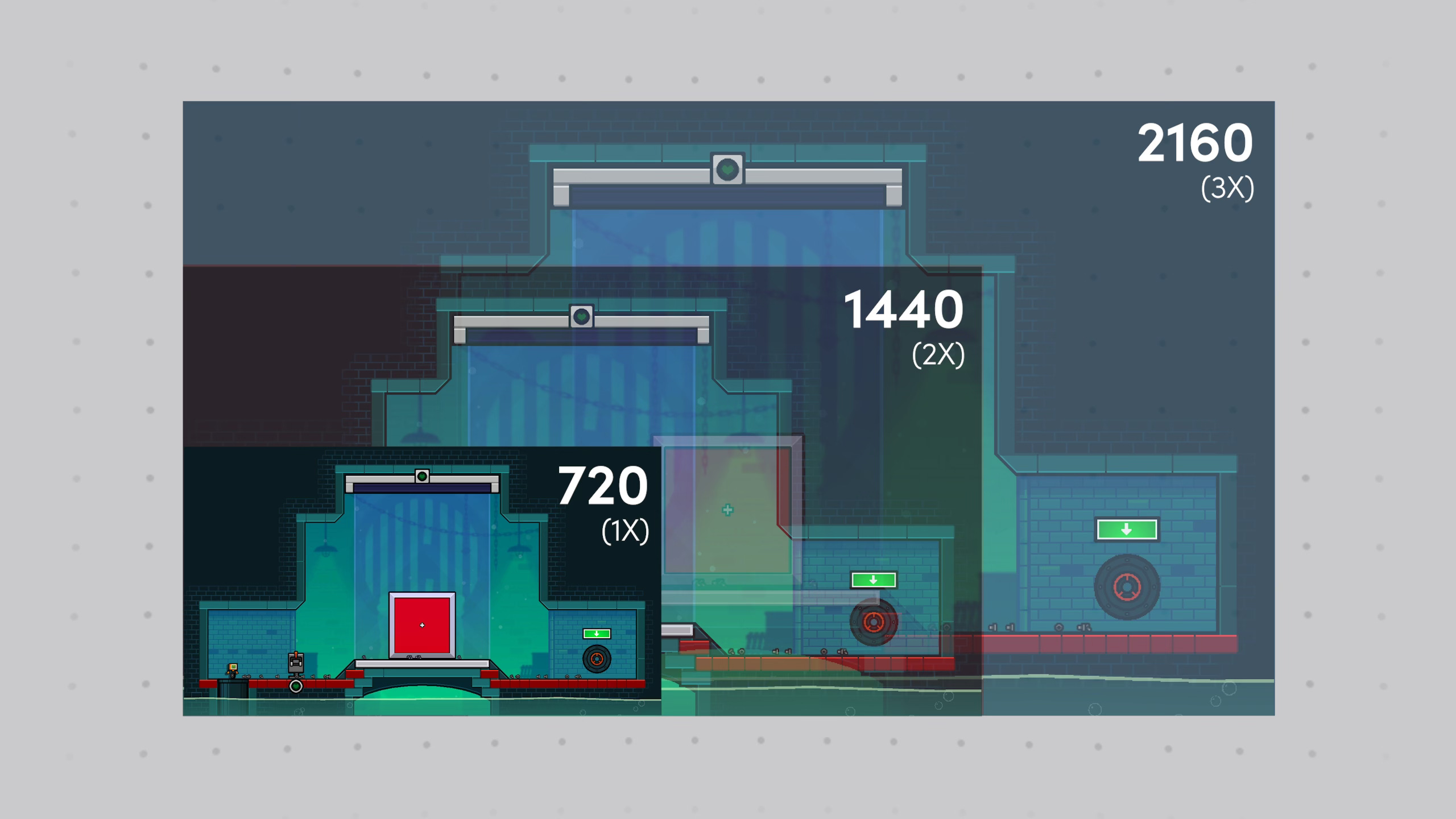 This means that a typical room might fill up 1280 by 720 pixels. So if you're playing on a really old 720p monitor, great. Pixel perfect. And if you're playing on a nice 1440p monitor like I do, cool. We can just double all of the pixels. And if you're playing on a really nice 4K TV, then I can just triple all of the pixels.