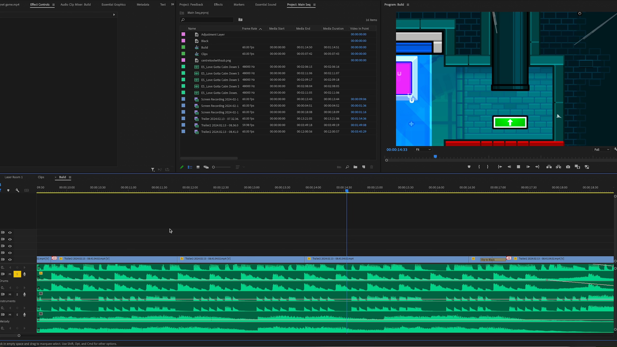 So with this new content I then recorded myself playing through those levels. I didn't have any music on but I did keep the sound effects on so those can be in the trailer. And, at the risk of talking more about screen resolutions, I recorded everything in 4K but the trailer is only 1080p so I can crop the most interesting bits without having to zoom in and lose image quality. I then threw this footage into Adobe Premiere and cut out all of the most interesting little clips - you know, interesting animations or depictions of mechanics or narrative beats or whatever.